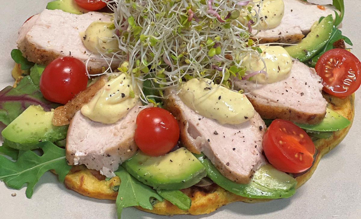 Legg vaffelen på en tallerken, ha i salat (babymix), kyllingskiver og topp med majones, avocado, sherrytomat og spicy spiremix.