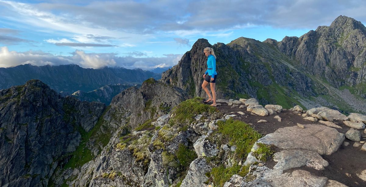 Lofoten uten sko: Sommer 2022 besøkte Christina Lofoten for første gang. Under turen opp til Festvågtind valgte hun å la skoene ligge. Den danske turisten hun møtte på ferja, og som hadde sagt ja til å bli med på turen, støttet henne i valget. (Foto: dansk turist og turfølge)